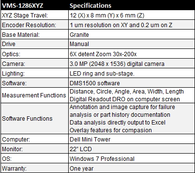 Large 12″x8″x6″ manual XYZ video cmm measurement systems featuring 1 micron resolution, high precision XYZ 3 axes measurement, digital read out (DRO) on computer. VMS-1286XYZ is an easy-to-use, powerful video based 3-axis manual measuring system. 3M digital camera for ultra high resolution image and sub-pixel accuracy measurement. Measurement software with selectable resolutions balances the speed and image resolution.