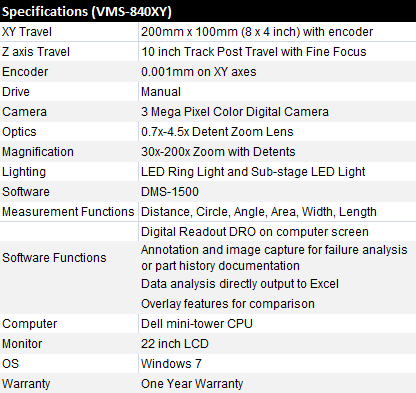 Inexpensive, high precision XY manual digital video measuring system with color digital camera and computer, track post with fine focus. VMS-840 is an easy-to-use, powerful video based 2-axis manual measuring system. 3M digital camera. The ultra-large image without compression and conversion greatly improves the sub-pixel accuracy and throughput. The software selectable resolution balances the speed and resolution.